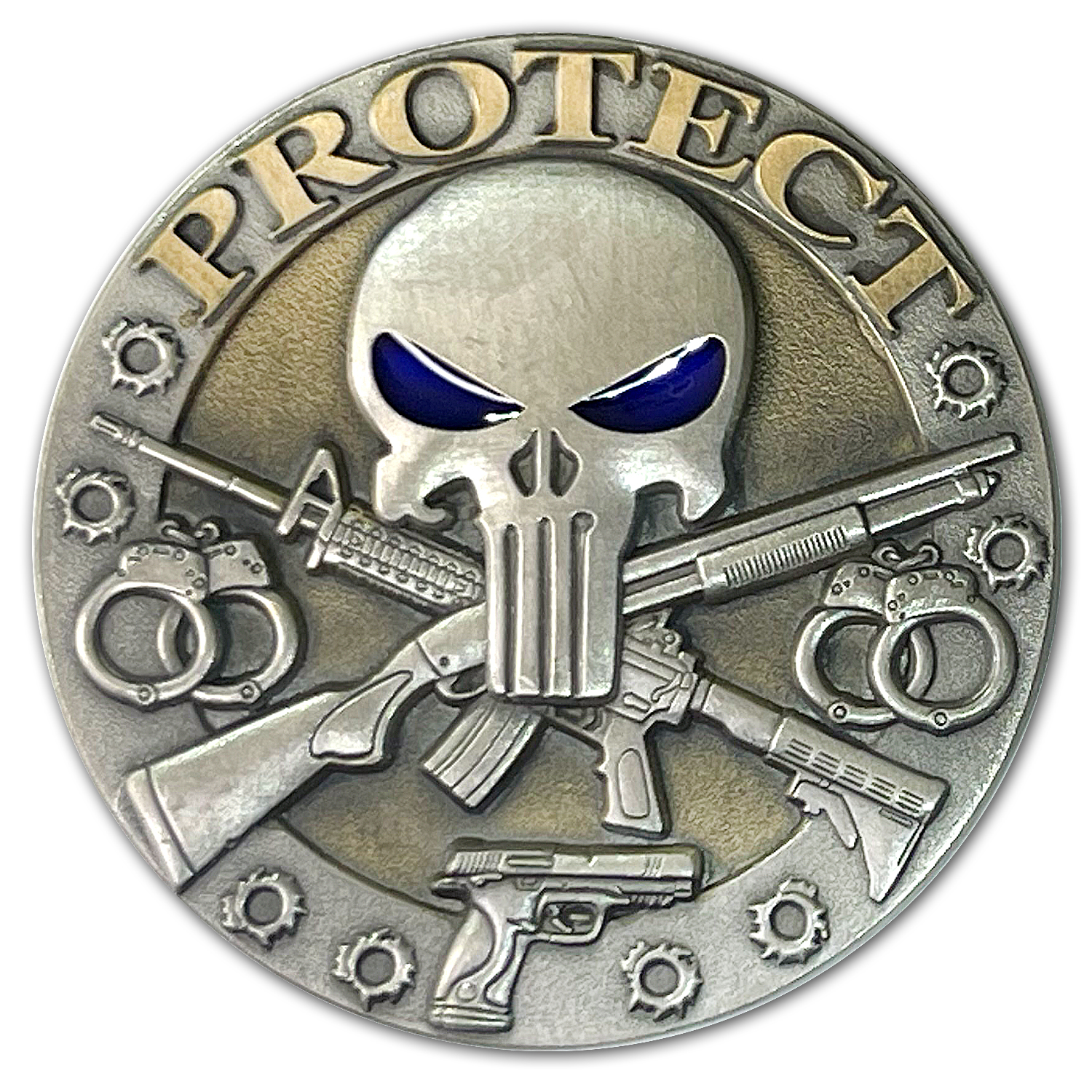 Protect and Serve Law Enforcement Challenge Coin designed and crafted for law enforcement officers and the law enforcement community. “To Serve and Protect,” is a phrase made famous by the Los Angeles Police Department and adopted, in various forms, by law enforcement agencies across the United States.